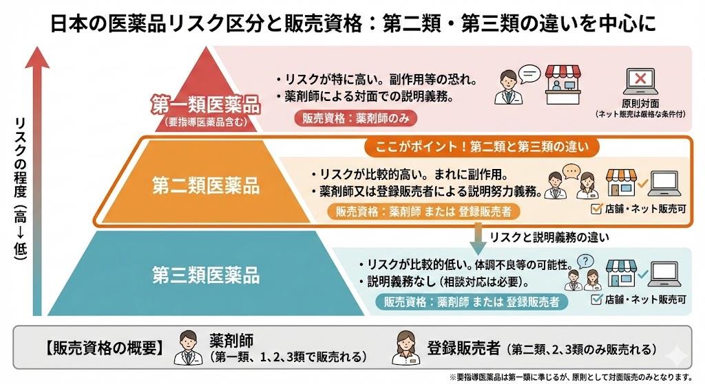 このように、第二類と第三類の違いは、単なるラベルの違いではなく、販売体制、接客深度、在庫管理、そして法的な責任の重さに直結しています。これらを正しく理解し、日々の業務に落とし込むことが、地域の健康を守るプロフェッショナルとしての第一歩となります。