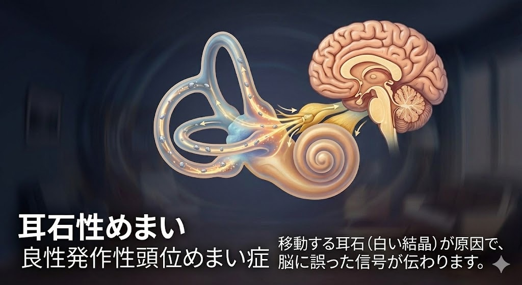 良性発作性頭位めまい症(BPPV:Benign Paroxysmal Positional Vertigo)は、頭の位置を変えたときに突然起こる回転性めまいを特徴とする疾患です。内耳の耳石器にあるカルシウム結晶(耳石)が適切な位置からずれ、三半規管内に入り込むことで発症します。