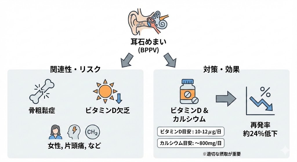 近年の研究により、良性発作性頭位めまい症と骨粗鬆症、ビタミンD欠乏との関連性が明らかになってきました。耳石は骨と同じくカルシウムでできているため、カルシウム代謝を調節するビタミンDが耳石の健康にも影響を与えると考えられています。