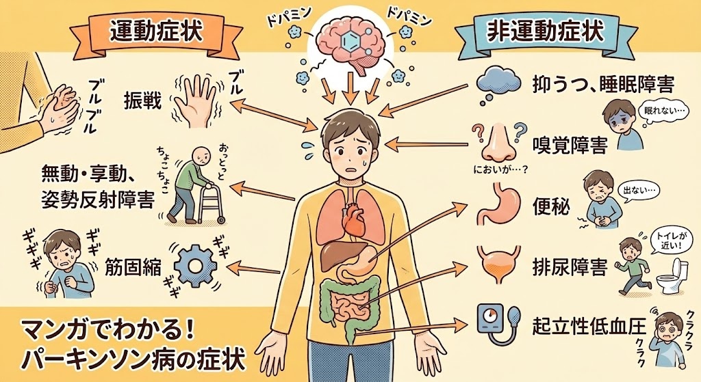 パーキンソン病では運動症状だけでなく、様々な非運動症状も現れます。これらの症状は患者さんのQOL(生活の質)に大きな影響を与えることがあり、適切な対応が求められます。