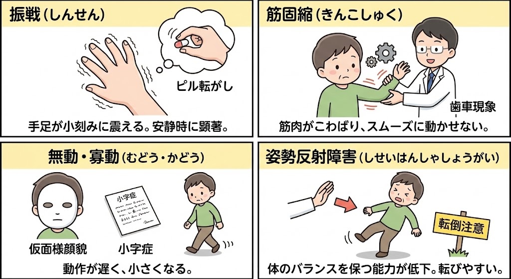 パーキンソン病の代表的な症状として、4つの主要な運動症状があります。これらは「4大症状」と呼ばれ、パーキンソン病の診断において重要な指標となります。