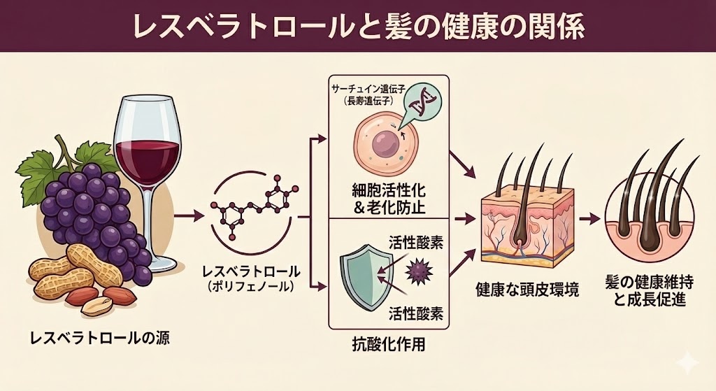 レスベラトロールは細胞の老化を防ぐ「長寿遺伝子」とも呼ばれるサーチュイン遺伝子を活性化させる作用があります。この作用により、頭皮の細胞の健康を維持し、髪の成長に必要な環境を整えることができると考えられています。