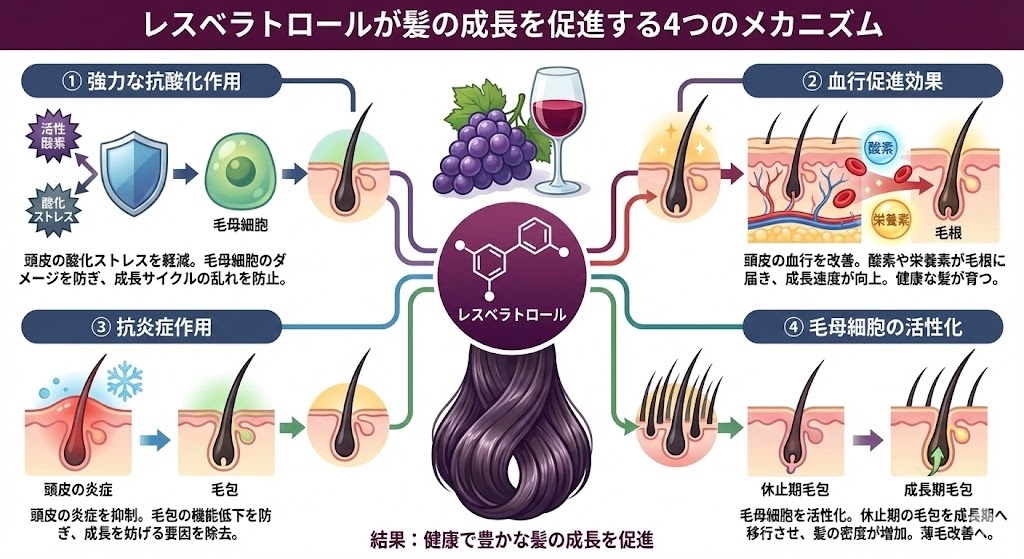 レスベラトロールが髪の成長を促進するメカニズムは複数あります。まず、強力な抗酸化作用により、頭皮の酸化ストレスを軽減します。酸化ストレスは毛母細胞にダメージを与え、髪の成長サイクルを乱す原因となりますが、レスベラトロールはこれを防ぐ働きがあります。
