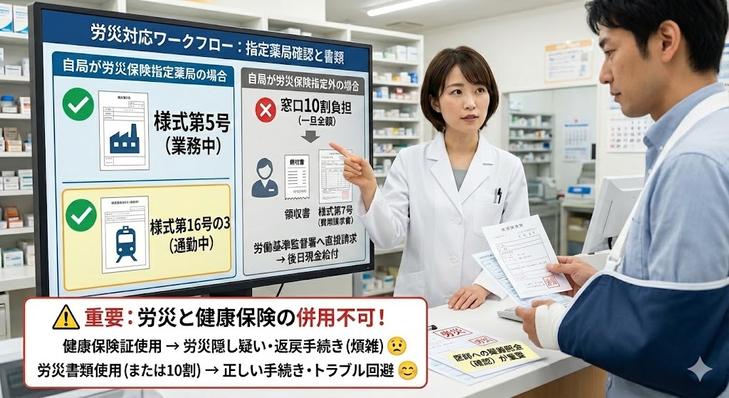 また、特殊な事例として「第三者行為災害」も考慮する必要があります。交通事故など、相手がいる事故で労災を適用する場合、さらに「第三者行為災害届」などの追加書類が必要になることがあります。この場合、損害保険会社との兼ね合いもあり、支払いの主体が複雑になることがあります。薬局としては、安易に判断せず、「労災担当の方(会社の人事や社労士)の指示に従ってください」と伝え、書類が完全に揃うまでは10割負担をお願いする、というスタンスを崩さない方が、結果として患者を守ることにつながります。曖昧な状態で安易に保険適用をしてしまうと、後で患者が多額の医療費返還を求められるリスクがあるからです。