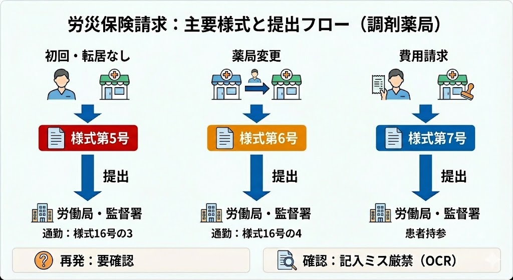 労災保険の請求業務において、最も複雑で間違いやすいのが「様式(書類)」の種類の使い分けです。適切な様式を適切なタイミングで提出しなければ、薬剤費の支払いが受けられない、あるいは大幅に遅れる可能性があります。ここでは、調剤薬局で頻繁に取り扱う主要な様式について、その用途と提出の流れを深掘りします。