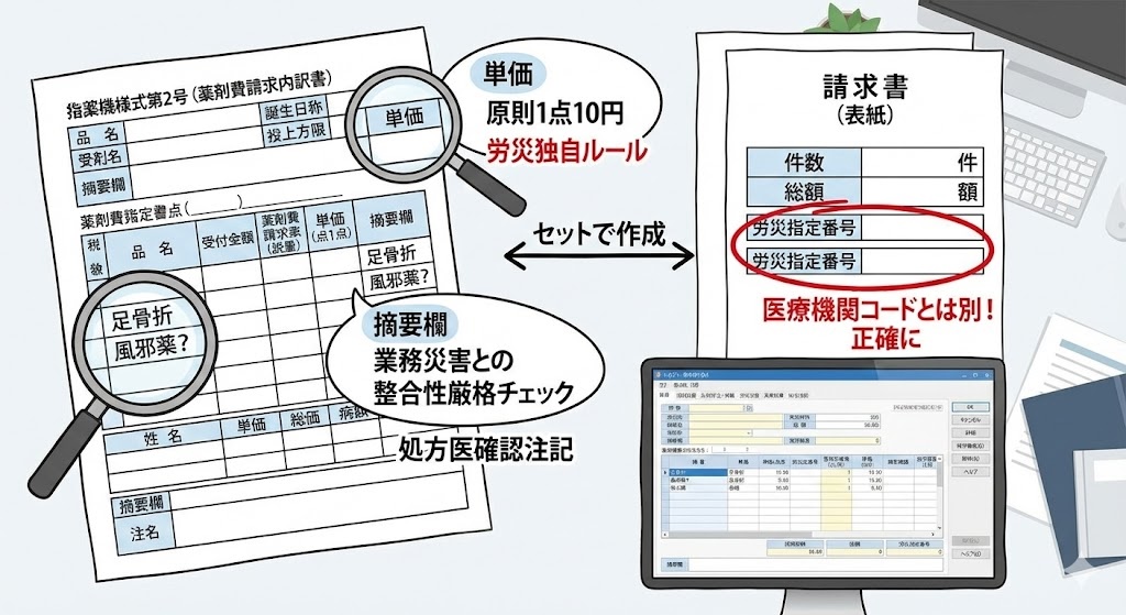 レセプト(薬剤費請求書)の作成においては、「指薬機様式第2号(薬剤費請求内訳書)」を使用します。記載内容で特に注意すべきは「単価」の設定です。労災保険では、原則として薬価基準の点数(1点10円)を使用しますが、技術料などの算定において労災独自の計算ルールが適用される場合があります。ただし、薬剤料に関しては健康保険と同様に計算されることが一般的です。重要なのは、摘要欄への記載事項です。労災レセプトでは、負傷の部位や処置の内容が、業務災害と整合性が取れているか厳しくチェックされます。例えば、足の骨折での労災認定なのに、風邪薬や湿布以外の内科薬が処方されている場合などは、査定の対象となるリスクが高いため、必要に応じて処方医への確認内容を注記するなどの対策が必要です。