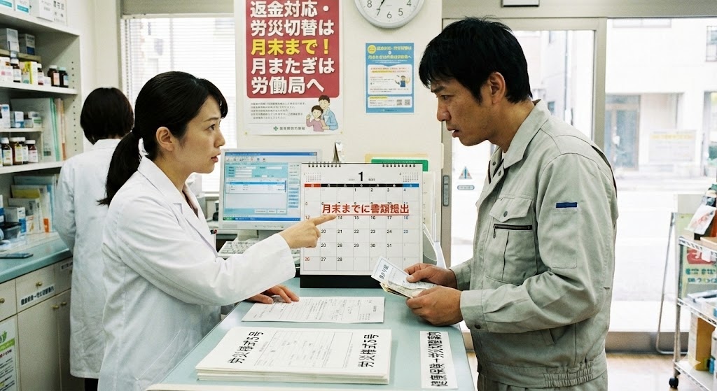 よくあるケースとして、患者が「仕事中の怪我だが、会社からまだ書類(様式5号)をもらっていない」状態で来局するパターンがあります。この場合、薬局は原則として薬剤費の全額(10割)を患者から預かり、「預かり証」または「領収書(全額負担用)」を発行します。そして、「今月中に書類を持ってきていただければ、窓口で差額(全額)を返金し、労災扱いに切り替えます」と案内するのが一般的です。月をまたいでしまうと、薬局でのレセプト処理が完了してしまうため、薬局窓口での返金ができなくなり、患者自身で労働局へ直接請求(様式7号)してもらう必要が出てきます。この「月またぎ」のデッドラインを患者に明確に伝えることが、クレーム防止の鍵です。「必ず月末までに書類をお持ちください」と念押しし、可能であればカレンダーで日付を示して説明するくらいの配慮が望ましいでしょう。