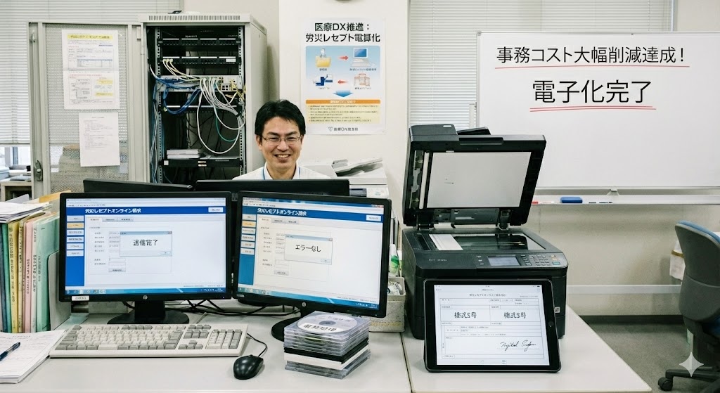 最後に、近年急速に進んでいる労災レセプトの「電算処理(電子化)」と「オンライン請求」について、解説します。これまで労災レセプトといえば、手書きや紙出力が当たり前で、様式5号などの書類も物理的に添付して郵送するのが常識でした。しかし、医療DXの流れに伴い、労災保険の世界でもデジタル化の波が押し寄せています。