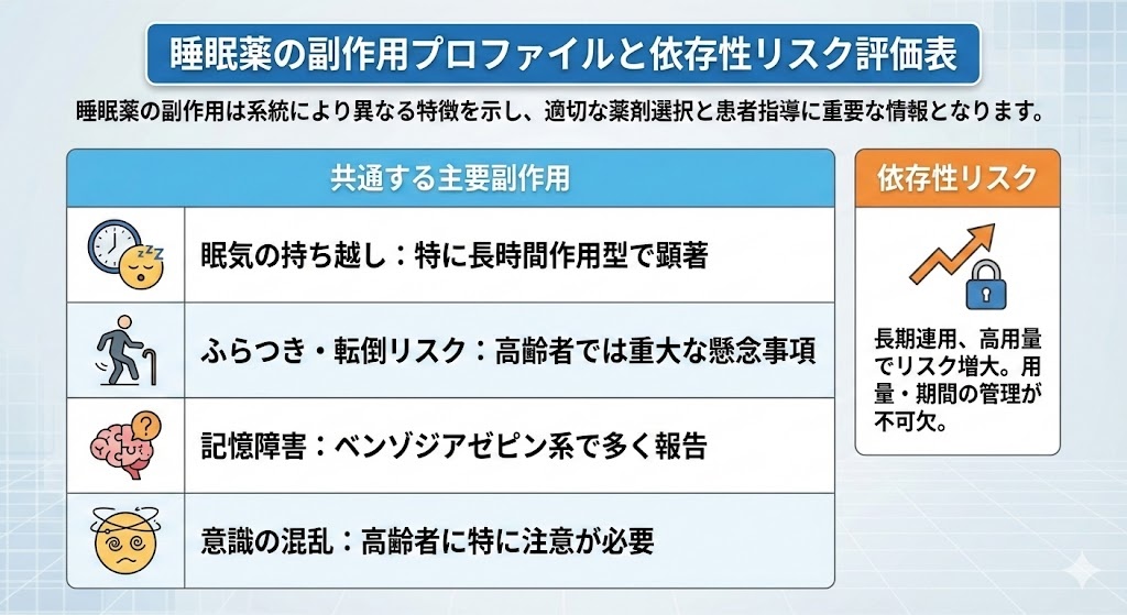 睡眠薬の副作用は系統により異なる特徴を示し、適切な薬剤選択と患者指導に重要な情報となります。